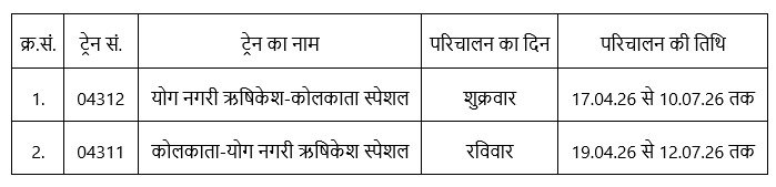धनबाद: 04.04.26 यात्रियों की सुविधा एवं उनके सुगम आवागमन के मद्देनजर धनबाद- गोमो- पारसनाथ- कोडरमा के रस्ते 01 जोड़ी स्पेशल ट्रेन का परिचालन किया जाएगा जिनका विवरण इस प्रकार है- क्र.सं. ट्रेन सं. ट्रेन...