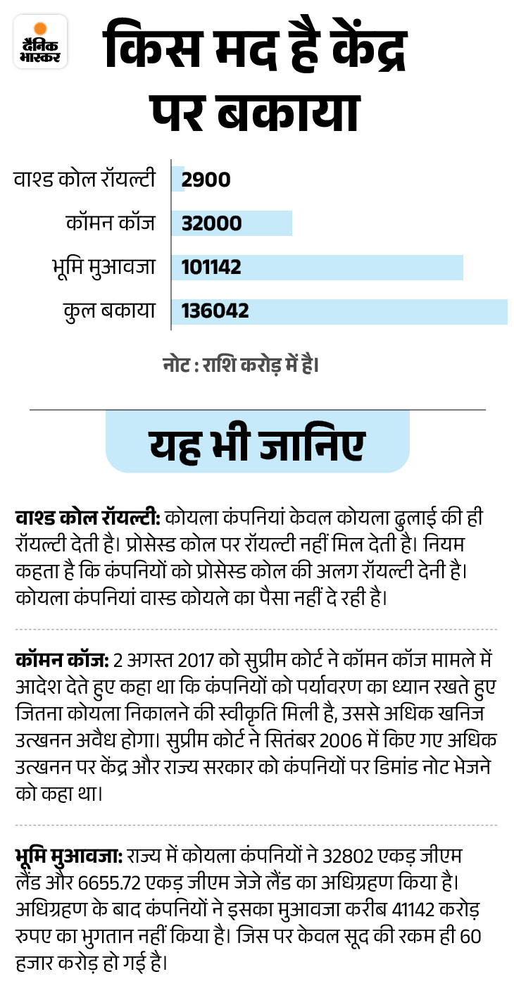 राज्य सरकार के केंद्रीय प्रधान मंत्री ने उन्हें वर्ष 2022 के लिए बजट में याद दिलाते हुए कहा कि केंद्रीय वित्त मंत्री सीएम मिशेल सोरेन ने उन्हें बकाये के लिए पत्र लिखा था। बैठक में उसने भी पेशगी पत्र लिखा। वाश्ड कोल की रॉयल्टी 2900 करोड़ और कॉमनवेल्थ कोल की रॉयल्टी 32,000 करोड़ पर है।