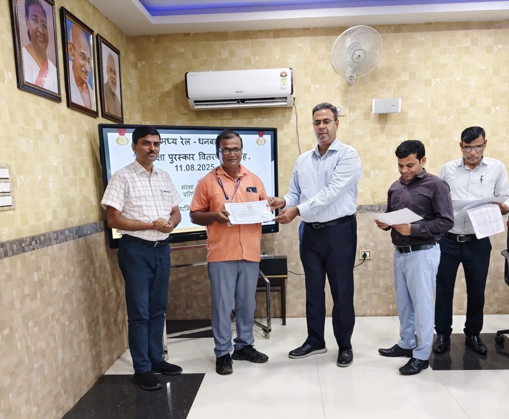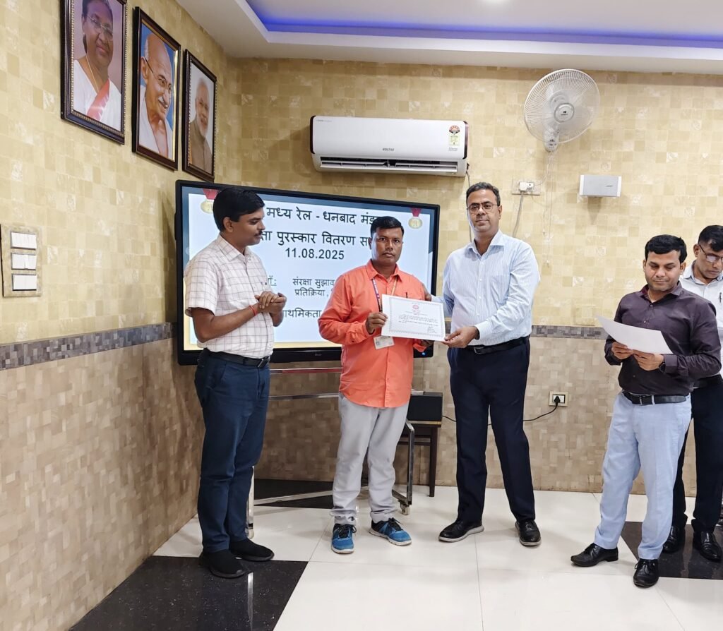 आज दिनांक 11.08.25 को मंडल रेल प्रबंधक कार्यालय, धनबाद में संरक्षा पुरस्कार वितरण समारोह का आयोजन किया गया | इस अवसर पर धनबाद मंडल के मंडल रेल प्रबंधक श्री अखिलेश मिश्र द्वारा मंडल के 29 कर्मचारियों को जुलाई 2025 माह में उनके द्वारा किये गए उत्कृष्ट कार्य के लिए संरक्षा पुरस्कार प्रदान किया गया । इन कर्मचारियों ने धनबाद मंडल के विभिन्न खण्डों में रेल फ्रैक्चर, हॉट एक्सल तथा अन्य संरक्षा संबंधी कार्यों का पता लगाया जिससे रेल परिचालन में आने वाली समस्याओं, दुर्घटनाओं/ असामान्यताओं को टला गया | इस अवसर पर मंडल के अन्य अधिकारीगण एवं कर्मचारीगण उपस्थित थे।