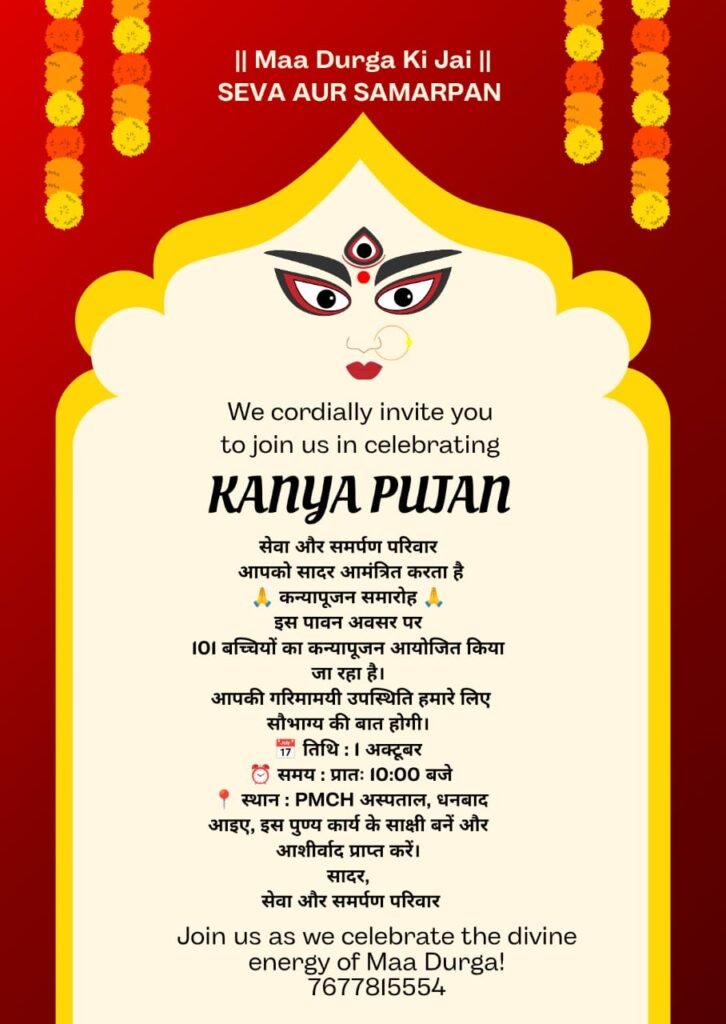 संस्था के सदस्यों ने कन्याओं को भोजन कराकर प्रसाद भी वितरित किया। मौके पर मौजूद पदाधिकारियों ने बताया कि नवरात्रि में कन्या पूजन का विशेष महत्व है। यह परंपरा मातृशक्ति का सम्मान और उनके प्रति आस्था का प्रतीक है।