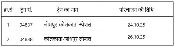 त्यौहार के मद्देनजर यात्रियों की सुविधा एवं उनके सुगम आवागमन हेतु जोधपुर-कोलकाता के मध्य 01 ट्रिप जोधपुर-कोलकाता-जोधपुर स्पेशल ट्रेन का परिचालन किया जायेगा जिनका विवरण इस प्रकार है –