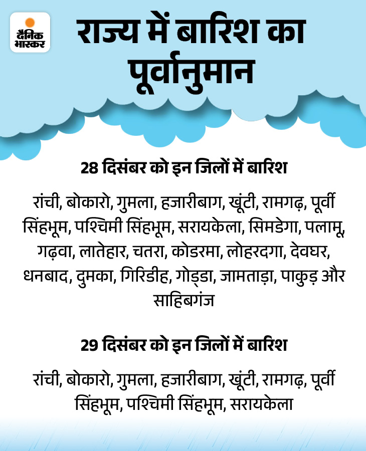 26 दिसंबर से शुरू हुई वेस्टर्न डिस्टर्बेंस का आज से झारखंड में प्रभाव देखने को मिलेगा। मौसम के अनुसार राज्य में 28 दिसंबर यानि आज और 29 दिसंबर को मध्यम दर्जे की बारिश होगी।