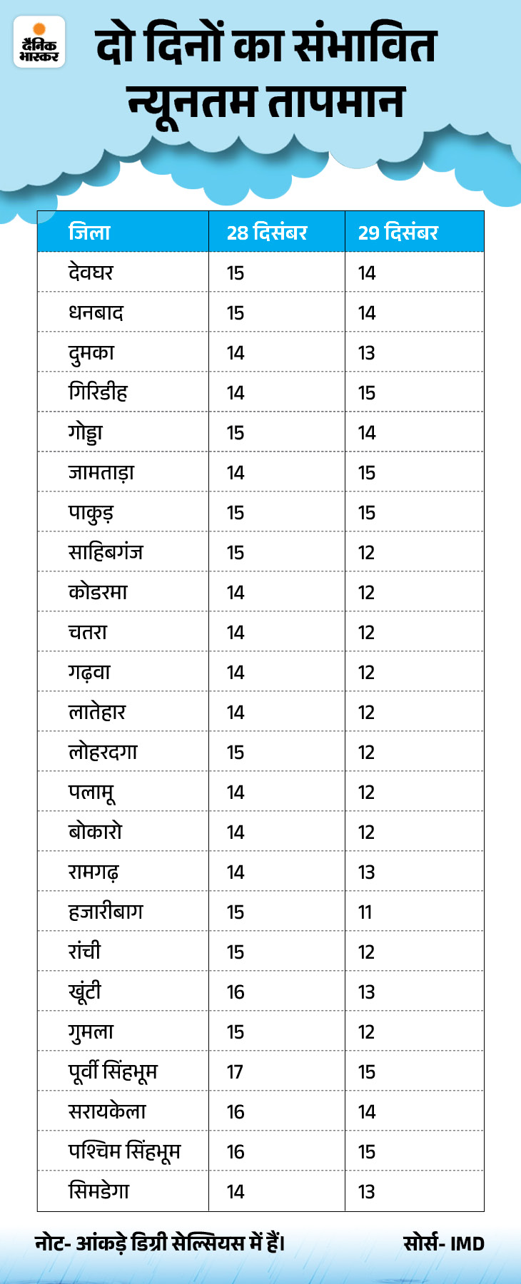 आकाश में बादल छाए रहने की वजह से अगले दो दिनों के न्यूनतम तापमान में कोई बड़ा बदलाव देखने को नहीं मिलेगा। 30 दिसंबर से स्काई साफ हो जाएगा। इसके बाद न्यूनतम न्यूनतम तापमान में चार डिग्री सेल्सियस तक की गिरावट देखने को मिलेगी। 30 दिसंबर को सुबह का समय घना कोहरा रहेगा। 28 और 29 को होने वाली बारिश की वजह से घना कोहरा देखने वाला है। इसे लेकर येलो ऑफर जारी किया गया है।