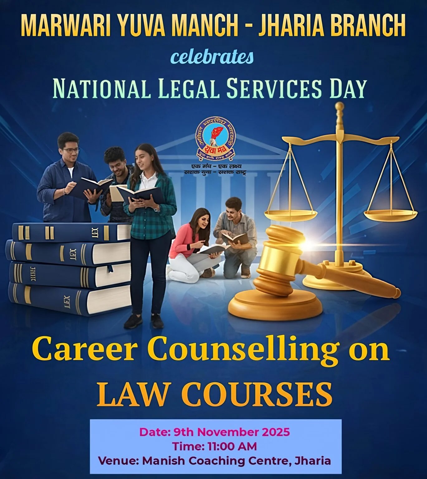 झरिया (JHARIA): राष्ट्रीय विधिक सेवा दिवस के अवसर पर मारवाड़ी युवा मंच, झरिया शाखा ने रविवार, 9 नवंबर 2025 को मनीष कोचिंग सेंटर में विधि शिक्षा और करियर संभावनाओं पर केंद्रित एक विशेष करियर काउंसलिंग कार्यक्रम का आयोजन किया। आयोजन का मुख्य उद्देश्य विद्यार्थियों को कानून की पढ़ाई से जुड़ी जानकारी, भविष्य के विकल्प और प्रवेश प्रक्रियाओं के बारे में विस्तृत मार्गदर्शन उपलब्ध कराना था।