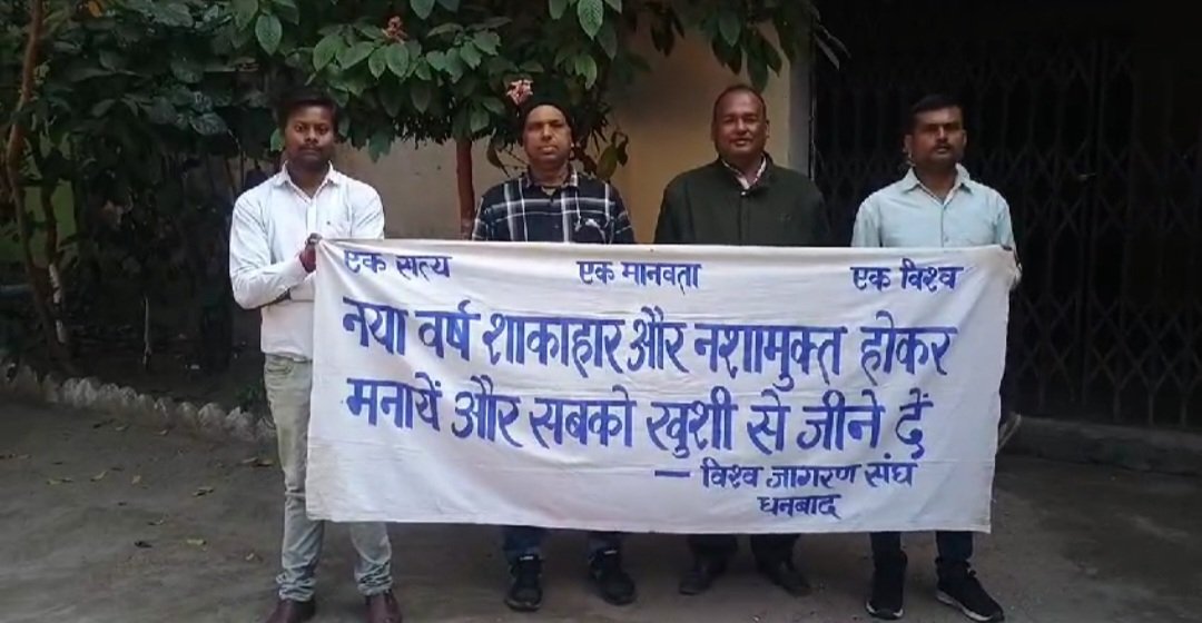 धनबाद। 29 दिसंबर 2024: विश्व जागरण संघ, हिरापुर, धनबाद ने नए वर्ष 2025 को शाकाहार और नशामुक्ति के साथ मनाने की अपील की। संगठन के सदस्यों ने बैनर और पोस्टर के माध्यम से यह संदेश दिया कि मानवता और खुशी के लिए नशामुक्त और शाकाहारी जीवनशैली अपनाना जरूरी है।