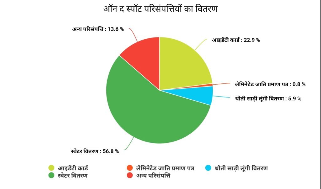 शिविरों के दौरान 24 लाभुकों को लेमिनेटेड जाति प्रमाण पत्र, 688 स्वयं सहायता समूह / क्लस्टर मेंबर को आइडेंटी कार्ड का वितरण, 35 को साइकिल, 1706 लाभुकों को स्वेटर तथा अन्य 407 सहित 2860 लाभुकों के बीच ऑन द स्पॉट परिसंपत्तियों का वितरण किया गया।