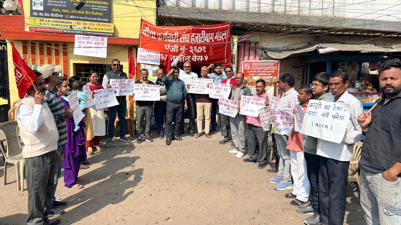 धनबाद:भारत का मजदूर वर्ग बुधवार 12 फ़रवरी को एक दिवसीय राष्ट्रव्यापी हड़ताल पर है। इस हड़ताल का आह्वान 10 केंद्रीय ट्रेड यूनियनों और अर्थव्यवस्था के विभिन्न क्षेत्रों में लाखों श्रमिकों का प्रतिनिधित्व करने वाले स्वतंत्र अखिल भारतीय संघों द्वारा किया गया है। देशभर के बीमा कर्मचारियों द्वारा अपने अखिल भारतीय बीमा कर्मचारी संघ (आईआईइएए) के आह्वान पर पूर्ण सहभागिता के साथ इस हड़ताल में भागीदारी निभाई गई।हजारीबाग मंडल के स्तर पर तमाम एलआईसी कर्मियों ने अपने संगठन बीमा कर्मचारी संघ हजारीबाग मंडल (आईइएएचडी) के बैनर तले अपने मंडल कार्यालय के अधिकार क्षेत्र के तहत आने वाले सभी 37 कार्यालयों में सम्पूर्ण तालाबंदी कर पूरी तरह से काम रोक कर इस हड़ताल को अपने स्तर से शत प्रतिशत अमली जामा पहनाया गया।इस अवसर पर धनबाद जिले के सभी एल आई सी कार्यालय में पूर्ण हड़ताल रही। इस अवसर पर अपना सन्देश देते हुए आईइएएचडी के मंडलीय महासचिव जगदीश चंद मित्तल ने कहा 12 फ़रवरी निर्धारित औद्योगिक हड़ताल केवल नए श्रम संहिताओं, प्रत्यक्ष विदेशी निवेश की सीमा में वृद्धि, या सार्वजनिक क्षेत्र के उपक्रमों के विनिवेश के विरुद्ध एक सामान्य विरोध नहीं है। यह वास्तव में भारतीय अर्थव्यवस्था को कॉरपोरेट हितों के पक्ष में पुनर्गठित करने की प्रक्रिया के खिलाफ एक गहन और मौलिक प्रतिरोध है-जिसका भार श्रमिकों, किसानों और हाशिये पर खड़े समुदायों पर पड़ रहा है।संघ के अध्यक्ष हेमंत मिश्रा ने कहा कि इस हड़ताल के केंद्र में चार श्रम संहिताओं के प्रति विरोध है। हमारा तर्क है कि इन संहिताओं ने लंबे समय से प्राप्त श्रमिक सुरक्षा प्रावधानों को कमजोर किया है। इन कानूनों के एकीकरण से नियुक्ति और छंटनी आसान हुई है, सामूहिक सौदेबाजी के अधिकार कमजोर हुए हैं, तथा मजदूरी, रोजगार सुरक्षा और कार्यस्थल सुरक्षा सुनिश्चित करने वाले नियामक तंत्र का क्षरण हुआ है। हड़ताल को सफल बनाने के लिए हेमंत मिश्रा, जगदीश चंद्र मित्तल, अमित कुमार, सुबीर राम,अमरजीत राजवंशी, निशेष कुमार, बासु बहादुर, चंदन झा, राहुल कुमार, संजय पाठक, मनीषा कुमारी, नयन शर्मा, जागेश्वर राम ,अभिषेक कुमार सुशील भगत समेत अन्य का योगदान रहा।
