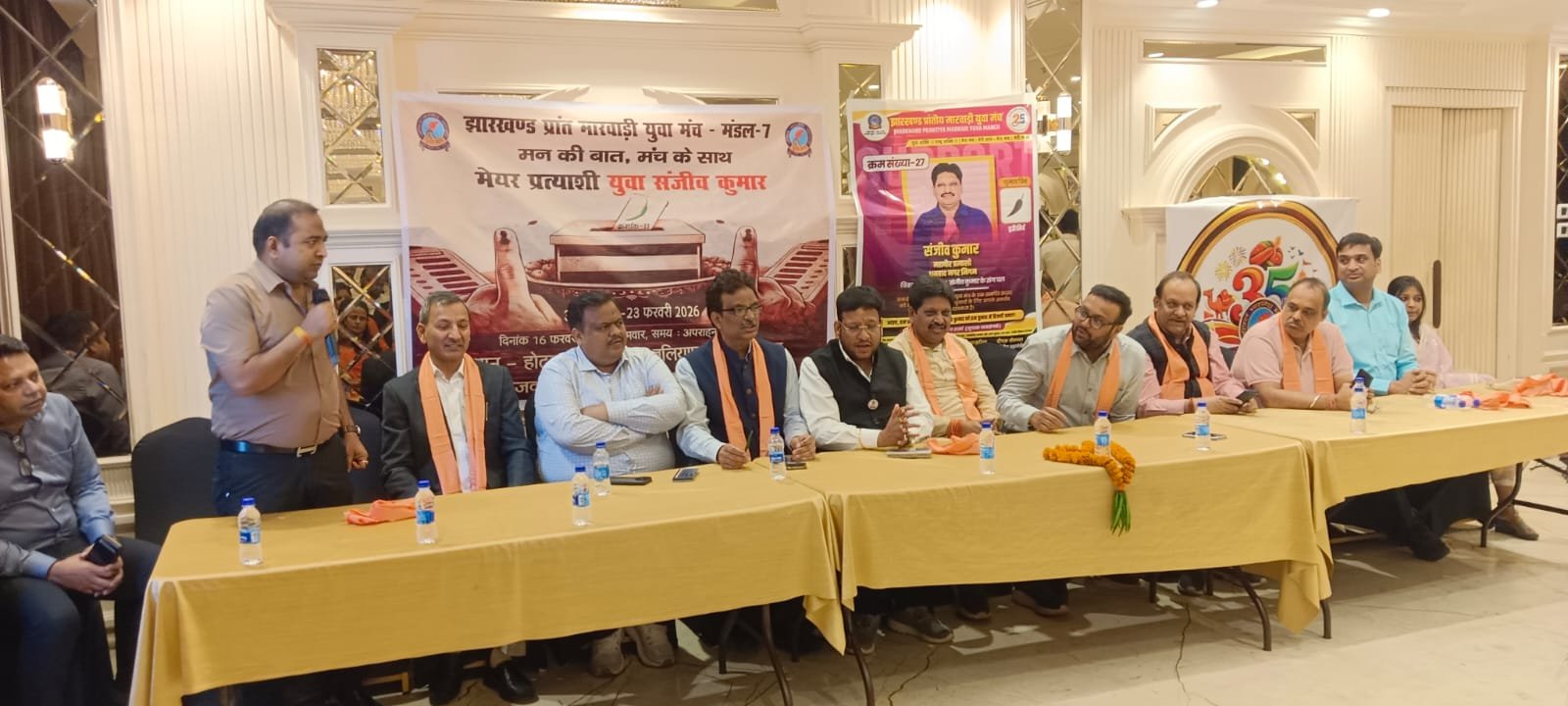 धनबाद:झारखंड प्रांत मारवाड़ी युवा मंच ने सोमवार को धनबाद नगर निगम चुनाव के संदर्भ में मंच सदस्य युवा संजीव कुमार जी के समर्थन में एक महत्वपूर्ण मंडल स्तरीय बैठक का सफल आयोजन किया। यह बैठक क्लार्क्स इन होटल, धनबाद में संपन्न हुई, जिसमें समाज के प्रमुख पदाधिकारियों एवं सदस्यों ने भाग लिया। बैठक का उद्देश्य आगामी चुनावों में संजीव कुमार के पक्ष में एकजुटता प्रदर्शित करना तथा चुनावी रणनीति पर विचार-विमर्श करना था।