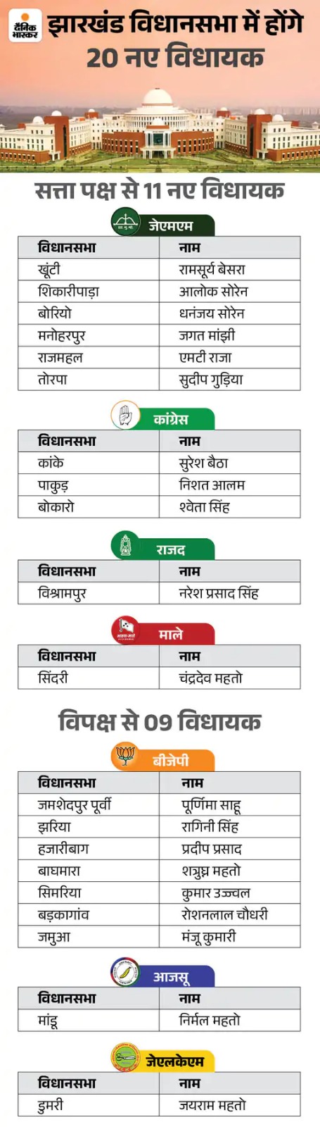 इसमें अतिरिक्त सदनों में 20 नये विधायक भी शामिल होंगे। वहीं अब तक की संभावनाओं के मुताबिक नेता प्रतिपक्ष भी नहीं होंगे। अब तक इनका चयन नहीं हुआ है। वहीं 10 दिसंबर को विधानसभा में राष्ट्रपति का चुनाव होना है। नाली सेमु झामो के विधायक रबींद्रनाथ महतो फिर से इंजीनियर बन सकते हैं।