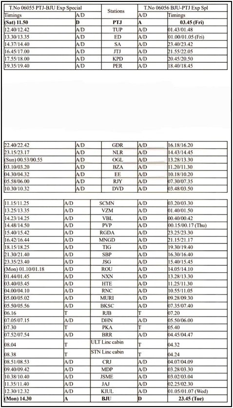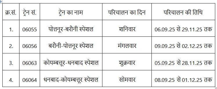 - गाड़ी संख्या 06055/06056 पोत्तनूर-बरौनी-पोत्तनूर (कोयम्बत्तूर) स्पेशल (किउल-झाझा- चितरंजन-धनबाद-रांची-राउरकेला-सम्बलपुर-काटपाडी के रास्ते): गाड़ी संख्या 06055 पोत्तनूर-बरौनी स्पेशल 06.09.2025 से 29.11.2025 तक प्रत्येक शनिवार को पोत्तनूर (कोयंबटूर) से 11.50 बजे खुलकर सोमवार को 07.05 बजे धनबाद रूकते हुए 14.30 बजे बरौनी पहुंचेगी । वापसी में गाड़ी संख्या 06056 बरौनी-पोत्तनूर स्पेशल 09.09.2025 से 02.12.2025 तक प्रत्येक मंगलवार को बरौनी से 23.45 बजे खुलकर बुधवार को 05.50 बजे धनबाद रूकते हुए शुक्रवार को 03.45 बजे पोत्तनूर पहुंचेगी । इस स्पेशल में शयनयान श्रेणी के 17, तृतीय वातानुकूलित श्रेणी के 03 एवं द्वितीय वातानुकूलित श्रेणी का 01 होंगे ।