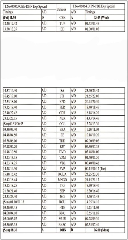 - गाड़ी संख्या 06063/06064 कोयम्बत्तूर-धनबाद-कोयम्बत्तूर स्पेशल (रांची-राउरकेला- सम्बलपुर-काटपाडी के रास्ते): गाड़ी संख्या 06063 कोयम्बत्तूर-धनबाद स्पेशल 05.09.2025 से 28.11.2025 तक प्रत्येक शुक्रवार को कोयंबटूर से 11.50 बजे खुलकर रविवार को 08.30 बजे धनबाद पहुंचेगी । वापसी में गाड़ी संख्या 06064 धनबाद-कोयम्बत्तूर स्पेशल 08.09.2025 से 01.12.2025 तक प्रत्येक सोमवार को धनबाद से 06.00 बजे खुलकर बुधवार को 03.45 बजे कोयम्बत्तूर पहुंचेगी । इस स्पेशल में शयनयान श्रेणी के 15, तृतीय वातानुकूलित श्रेणी के 02 एवं द्वितीय वातानुकूलित श्रेणी का 01 होंगे ।