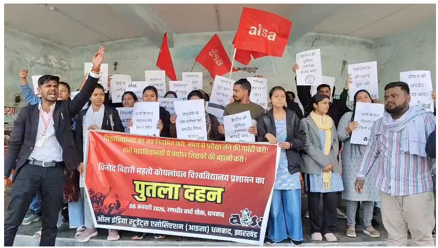 एआईएसए ने मंगलवार को जिले के प्रमुख रणधीर वर्मा चौक पर बीबीएमकेयू के कुलपति डॉ. राम कुमार का पुतला दहन कर जोरदार विरोध प्रदर्शन किया। इस दौरान बड़ी संख्या में छात्र मौजूद रहे और कुलपति के खिलाफ जमकर नारेबाजी की। प्रदर्शन कर रहे छात्रों का कहना है कि विश्वविद्यालय में लंबे समय से शैक्षणिक अव्यवस्थाएं बनी हुई हैं, लेकिन प्रशासन इस ओर कोई ध्यान नहीं दे रहा है। छात्रों ने आरोप लगाया कि सेशन डिले की समस्या से छात्रों का भविष्य प्रभावित हो रहा है। इसके अलावा विश्वविद्यालय और कॉलेजों की लाइब्रेरी में लाइट की समुचित व्यवस्था नहीं है, बैठने के लिए बेंचों की कमी है, स्मार्ट बोर्ड जैसे आधुनिक शैक्षणिक संसाधन उपलब्ध नहीं कराए गए हैं, वहीं शौचालयों की साफ-सफाई की स्थिति भी बेहद खराब है। एआईएसए का कहना है कि इन मांगों को लेकर कुलपति को कई बार ज्ञापन सौंपा गया, लेकिन अब तक विश्वविद्यालय प्रशासन की ओर से कोई ठोस पहल नहीं की गई। इससे छात्रों में भारी आक्रोश है। प्रदर्शन के दौरान छात्रों ने स्पष्ट चेतावनी दी कि यदि जल्द ही उनकी मांगों पर सकारात्मक कार्रवाई नहीं की गई, तो विनोद बिहारी महतो कोयलांचल विश्वविद्यालय में तालाबंदी की जाएगी, जिसकी पूरी जिम्मेदारी विश्वविद्यालय प्रशासन की होगी।