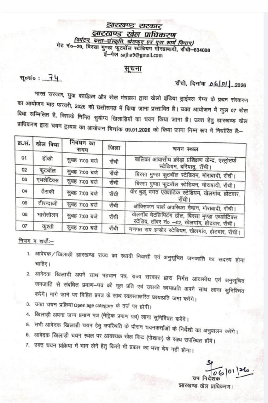 भारत सरकार युवा और खेल मंत्रालय द्वारा खेलो इंडिया ट्राइवल गेम्स के प्रथम संस्करण के आयोजन माह फरवरी 2026 में किया जाना प्रस्तावित है। झारखंड खेल प्राधिकरण, रांची द्वारा उक्त आयोजन में झारखंड राज्य की टीम की भागेदारी को लेकर राज्य के योग्य ( पुरुष एवं महिला) खिलाड़ियों का ट्रायल 09 जनवरी को प्रातः 07 बजे रांची के विभिन्न स्टेडियमों में आयोजित किया गया है।