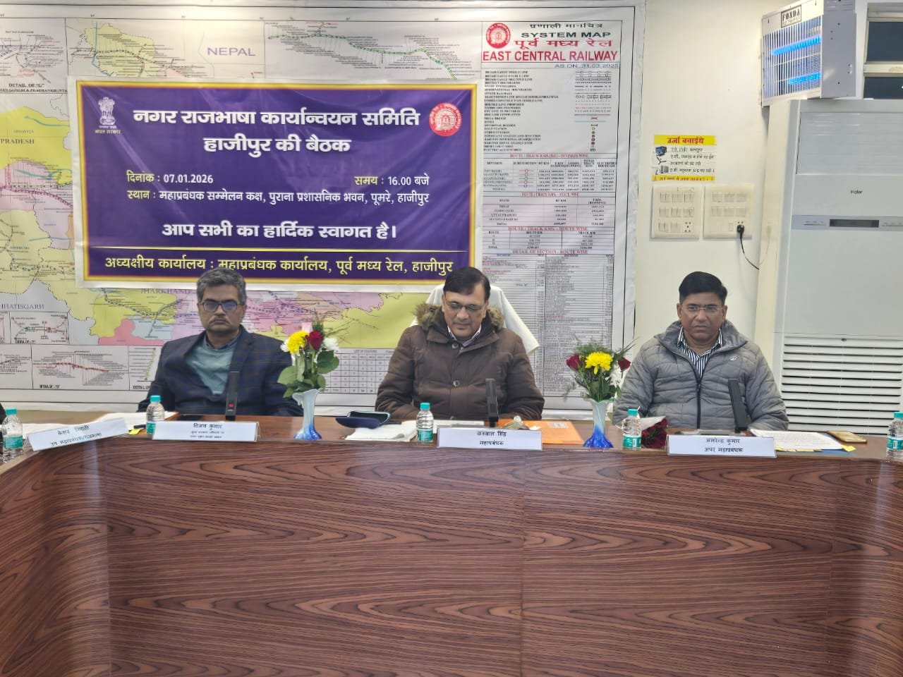 पूर्व मध्य रेल मुख्यालय, हाजीपुर में आज नगर राजभाषा कार्यान्वयन समिति की द्वितीय छमाही (संयुक्त) बैठक का आयोजन हुआ. इस बैठक की अध्यक्षता करते हुए महाप्रबंधक श्री छत्रसाल सिंह ने कहा कि हाजीपुर नगर राजभाषा नियम 1976 के तहत ‘क’ क्षेत्र में आता है यानी यह पूर्णतः हिंदी भाषी क्षेत्र है अतः यह स्वभाविक है कि यहाँ शत-प्रतिशत कार्य हिंदी में ही किया जाना अपेक्षित है. इसके लिए हम सभी मिलजुल कर एक ऐसे वातावरण का निर्माण करें जहाँ हमें हिंदी में कार्य करने में कोई झिझक नहीं हो बल्कि हिंदी में कार्य करना रोचक, सुगम एवं स्वभाविक हो.