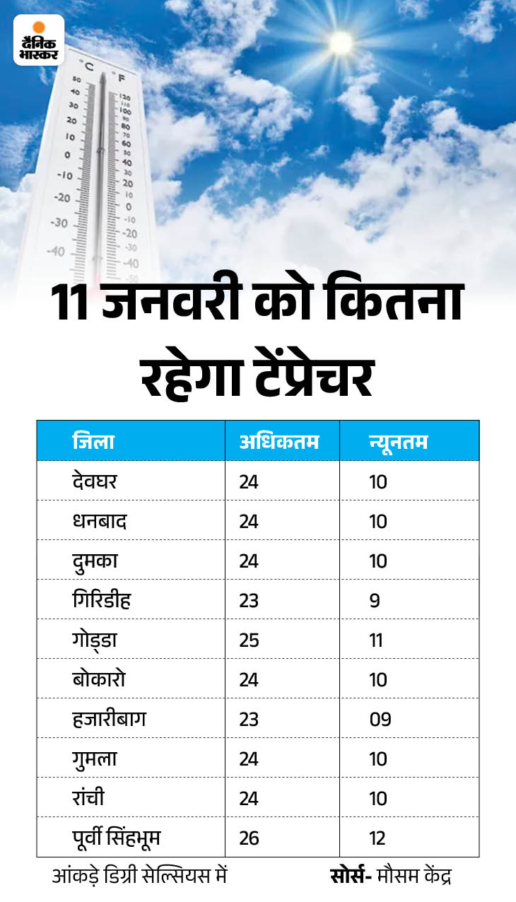विभाग के विभाग, 11 और 12 जनवरी से उत्तर-पश्चिमी भारत में पश्चिमी विक्षोभ का असर। इस कारण से उत्तर-पश्चिमी भारत में बारिश और बर्फबारी हो सकती है। यह झारखंड पर भी दिखता है। ठंड से कुछ राहत। 11 जनवरी को सुबह से न्यूनतम तापमान 2 से 3 डिग्री सेल्सियस तक बढ़ जाएगा। 13 जनवरी से न्यूनतम तापमान में फिर गिरावट होगी। मौसम में लगातार हो रही है रिलीज- आबाद से सबसे ज्यादा परेशानी बच्चे-बुजुर्गों को हो रही है।