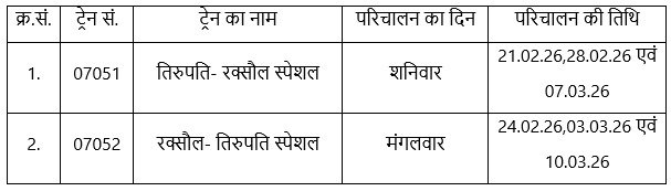 - 07051 तिरुपति- रक्सौल स्पेशल शनिवार 21.02.26,28.02.26 एवं 07.03.26