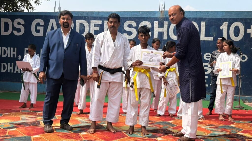राजगंज (धनबाद): ओकिनवा नाहा – ते गोजू- रयू कराटे फेडरेशन इन इंडिया के सोजन्य से राजगंज स्थित बड्स गार्डेन स्कूल, दलूडीह ,राजगंज में कराटे बेल्ट टेस्ट का आयोजन किया गया। इसमें विद्यालय में पूर्व से ही विद्यालय द्वारा प्रशिक्षित किए गए छात्र-छात्राओं का बेल्ट टेस्ट किया गया , जिसमें अर्पिता विश्वकर्मा,आद्या कुमारी, माही कुमारी ,जया लक्ष्मी ,आराध्या गुप्ता ,सूरज कुमार ,निधि कुमारी , सिद्धार्थ गोस्वामी ,ओंकार दुबे और दिव्यांशु मंडल को यैलो बेल्ट एवं रुद्र प्रताप महतो को ग्रीन बेल्ट प्रदान किया गया।इसके पूर्व जिला कराटे एसोसिएशन से आए हुए प्रशिक्षक टिंकू कुमार महतो एवं सोनू कुमार ठाकुर ने बच्चों का फिजिकल प्रशिक्षण टेस्ट लिया, सहयोगी के रूप में विद्यालय के कराटे शिक्षक सुनील कुमार महतो ने भरपूर साथ दिया। जिसमें उपरोक्त सभी छात्र- छात्राओं ने अपनी परीक्षा उत्तीर्ण की , कराटे एसोसिएशन के मुख्य प्रशिक्षक श्री साधन चंद्र लोहार के हाथों बेल्ट को ग्रहण किया, जांच परीक्षा के बाद के प्रशिक्षक के साथ मिलकर कराटे एसोसिएशन के द्वारा विद्यालय के प्राचार्य प्रमोद चौरसिया एवं चेयरमैन अमर कुमार पाल के हाथ से सभी उत्तीर्ण छात्र एवं छात्राओं को प्रमाण पत्र देकर सम्मानित किया।