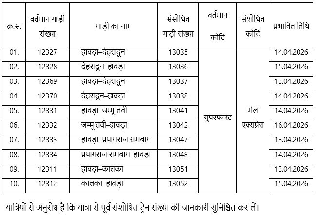 यात्रियों से अनुरोध है कि यात्रा से पूर्व संशोधित ट्रेन संख्या की जानकारी सुनिश्चित कर लें।