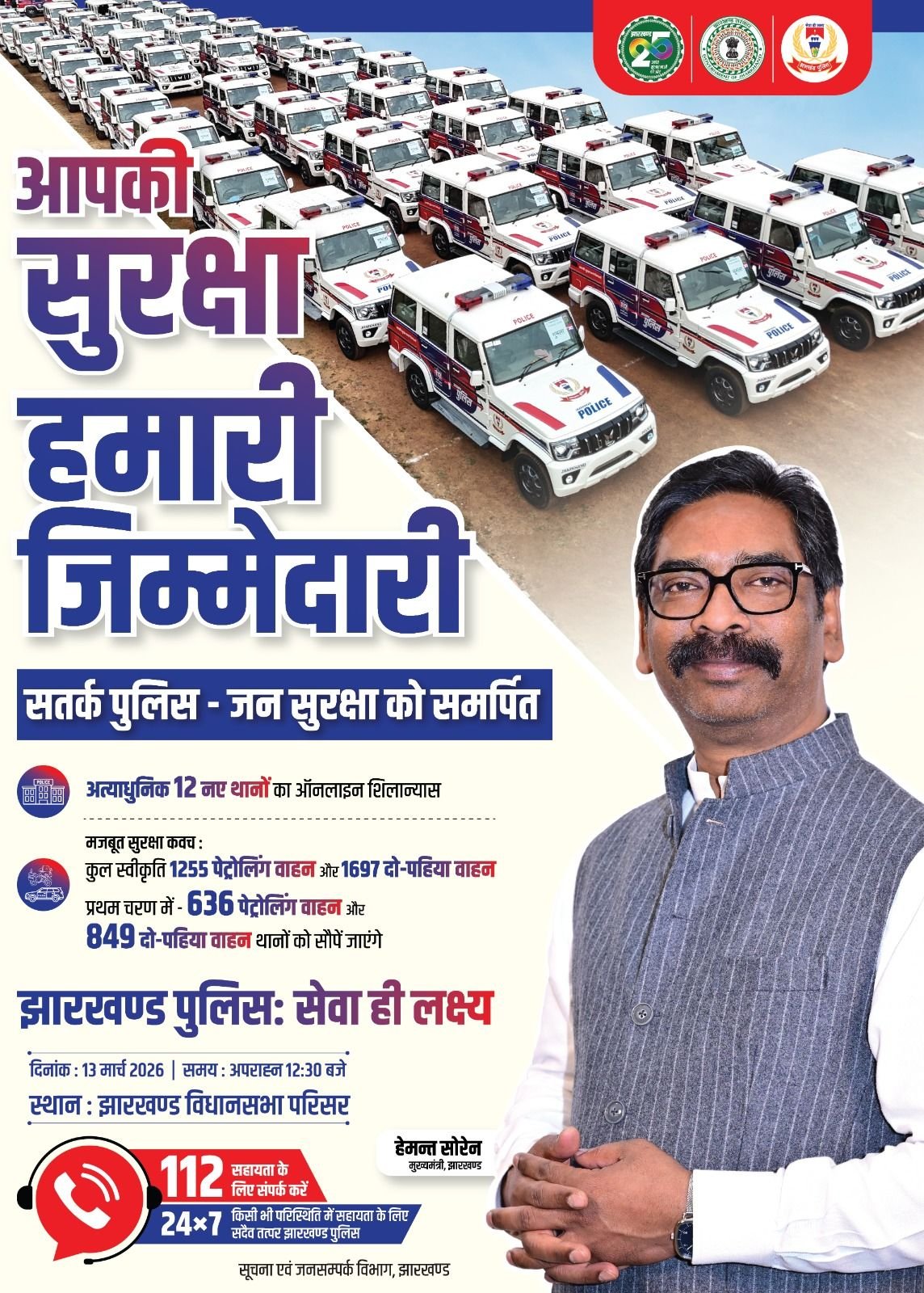 झारखण्डवासियों की सुरक्षा को और मजबूत करने के उद्देश्य से अबुआ सरकार ने राज्य के सभी थानों के लिए 1255 चार पहिया वाहन एवं 1697 दो पहिया वाहन स्वीकृत किए हैं। पहले चरण में 636 चार पहिया और 849 दो पहिया वाहन खरीदे जा चुके हैं, जिन्हें 13 मार्च 2026 को विभिन्न थानों को सौंपा जा रहा है ।