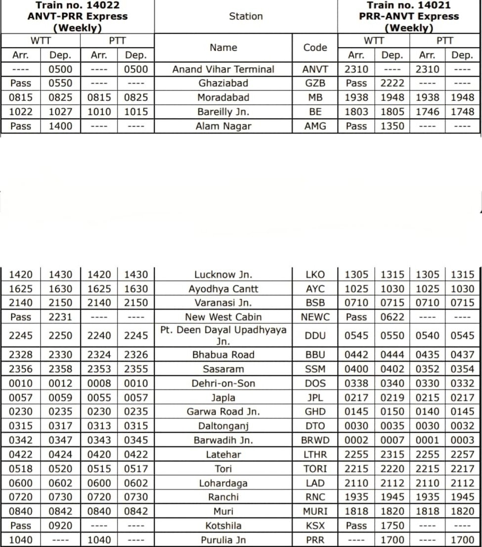 यात्रियों की सुविधा के मद्देनजर टोरी- लातेहार- बरवाडीह- डाल्टनगंज- गढ़वा रोड के रास्ते पुरुलिया- आनन्द विहार टर्मिनल के मध्य दिनांक 03.04.26 से प्रत्येक शुक्रवार को पुरुलिया स्टेशन से गाड़ी संख्या 14021 पुरुलिया-आनन्द विहार टर्मिनल एक्सप्रेस का नियमित परिचालन किया जायेगा l इसी प्रकार दिनांक 02.04.26 से प्रत्येक गुरुवार को आनन्द विहार टर्मिनल स्टेशन से गाड़ी संख्या 14022 आनन्द विहार टर्मिनल-पुरुलिया एक्सप्रेस का नियमित परिचालन किया जायेगा l
