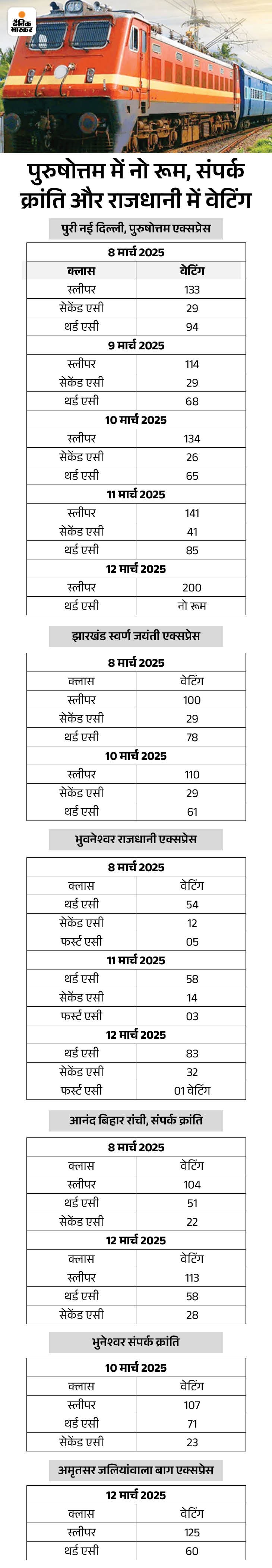 8 शयरा वैसी ट्रेनों के यात्रियों को लंबी वेटिंग के कारण सबसे ज्यादा परेशानियों का सामना करना पड़ेगा। चूंकि अभी से ही वेटिंग है और उस रूट में किसी भी होली स्पेशल ट्रेनों की घोषणा नहीं होने से यात्रियों को काफी परेशानियों का सामना करना पड़ेगा।